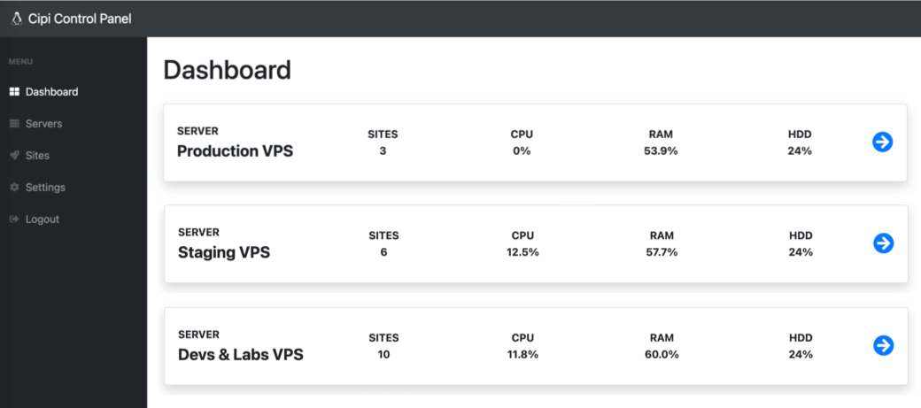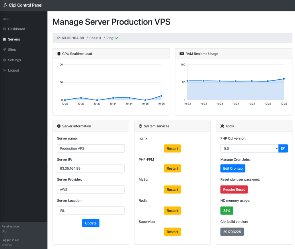 Cipi shows realtime usage status of server CPU and RAM into "MANAGE SERVER" area.